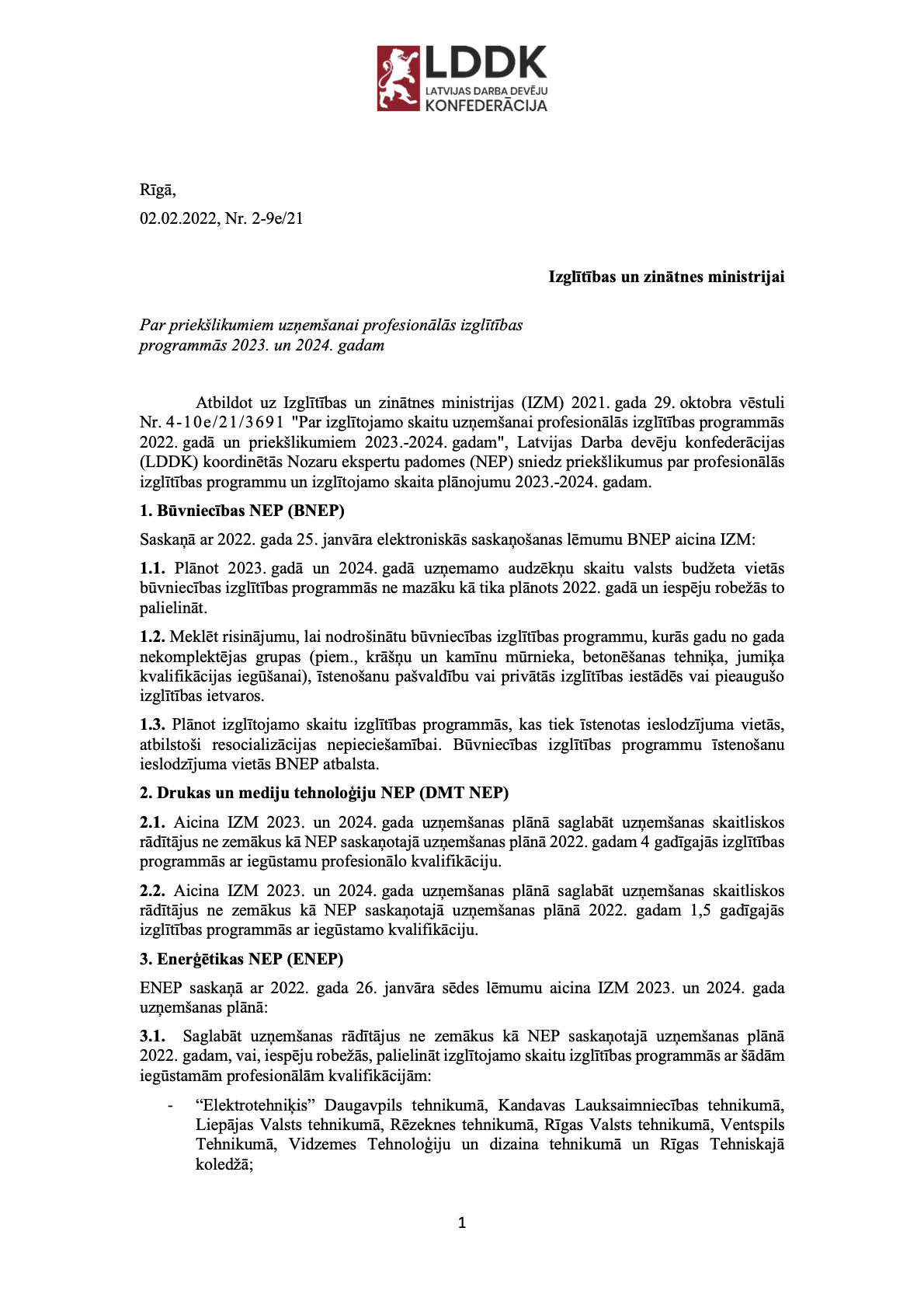 Ņemot vērā darba tirgus pieprasījumu pēc speciālistiem ar profesionālo izglītību, pārsvarā visi NEP aicina IZM plānot 2023. gadā un 2024. gadā uzņemamo audzēkņu skaitu valsts budžeta vietās profesionālās izglītības programmās ne mazāku kā tika plānots 2022. gadā un iespēju robežās to palielināt.