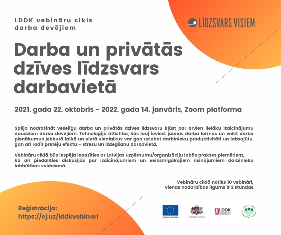 Latvijas Darba devēju konfederācija (LDDK) aicina darba devējus pieteikties apmācību programmai "Darba un privātās dzīves līdzsvars darbavietā”, kas sastāv no vebināru cikla un e-apmācību moduļa.