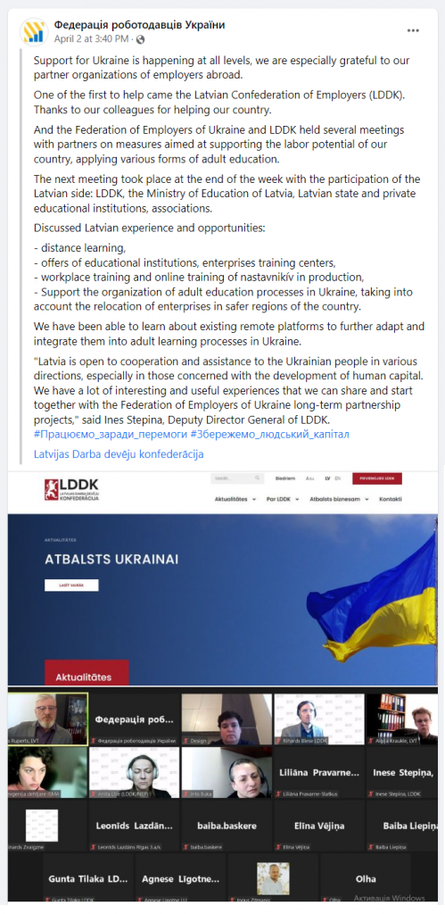 Latvijas Darba devēju konfederācija (LDDK) šī gada 1. aprīlī tiešsaistē tikās ar Ukrainas Darba devēju federācijas (The Federation of Employers of Ukraine, FEU) pārstāvjiem, lai pārrunātu atbalsta iespējas pieaugušo izglītības un nodarbinātības jautājumos.