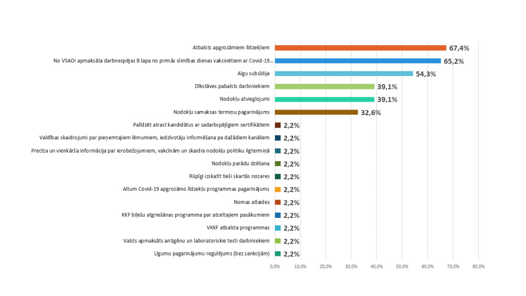 Lai mazinātu negatīvo ietekmi, uzņēmumu riskus bankrotēt un izvairītos no darbinieku atlaišanas, darba devēji norāda, ka ierobežojumu laikā būtu nepieciešams atbalsts apgrozāmo līdzekļu plūsmas nodrošināšanai. Kā otro svarīgāko darba devēji atzīst no VSAOI apmaksātas darbnespējas B lapas no pirmās slimības dienas ar Covid-19 saslimušiem darbiniekiem (65,2%). Tāpat darba devējiem būtiski saņemt atbalstu algu subsīdijām (54,3%), dīkstāves pabalstu darbiniekiem (39,1%), nodokļu atvieglojumus un samaksas termiņa pagarinājumu.