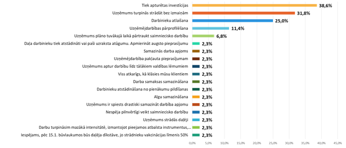 Ņemot vērā pandēmijas sekas un jaunu ierobežojumu ieviešanu, 38,6% plāno apturēt investīcijas, 25% plāno atlaist darbiniekus, 11,4% plāno uzņēmuma pārprofilēšanu, kā arī citas izmaiņas. Tomēr 31,8% uzņēmumu norāda, ka turpinās strādāt bez izmaiņām.